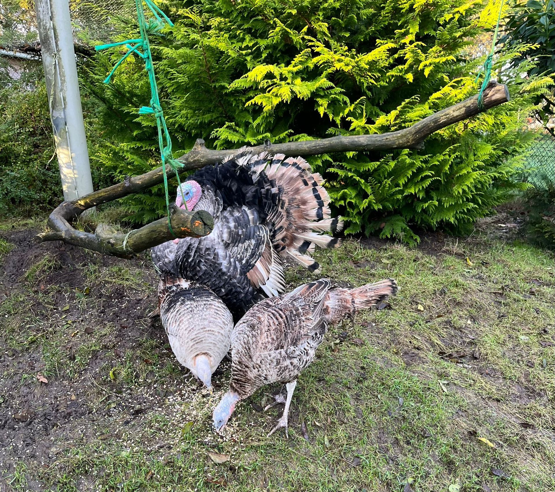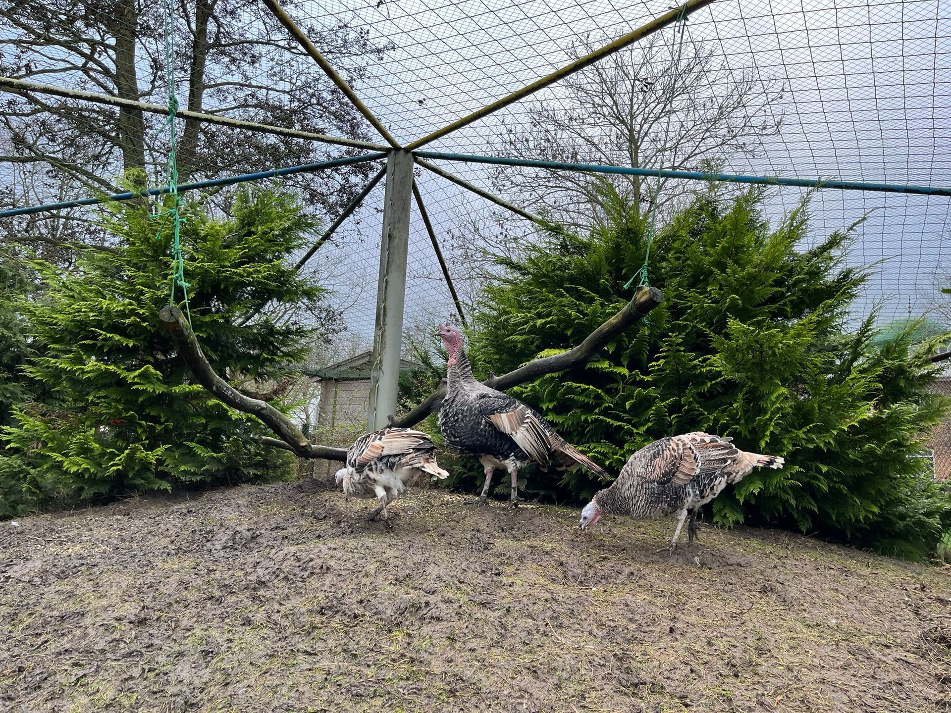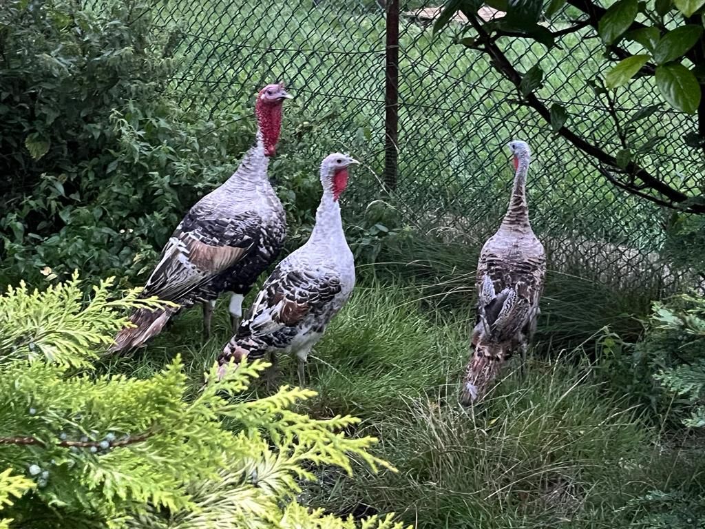 Harry en z'n meiden wonen bij ons op de 'kalkoenenberg'. Ze lopen daar lekker door het gras en tussen de struiken. In 2016 hebben we een nieuw nachtverblijf voor de kalkoenen gemaakt, zo zitten ze ook met regen lekker droog.